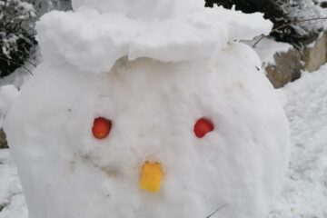 Diesen netten Schneemann ließen einige Mädchen während der großen Pause entstehen. Damit er sehen und riechen kann, teilten sie sogar ihre Jause mit ihm!