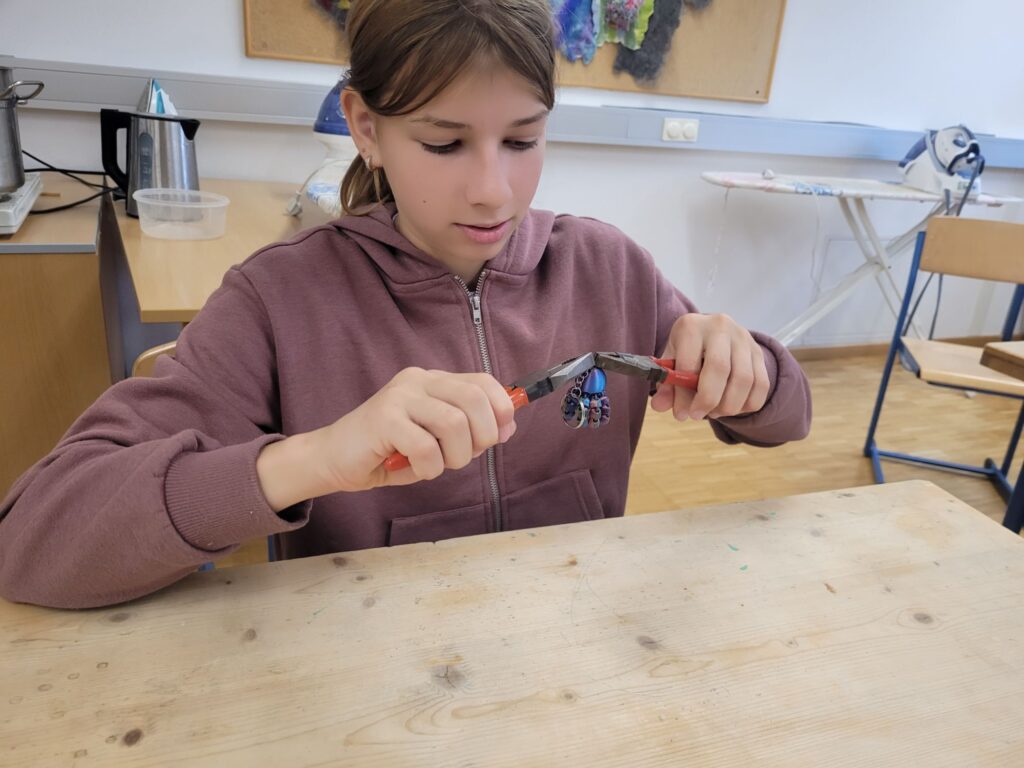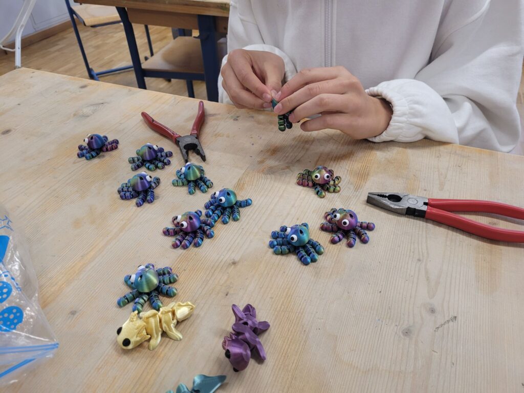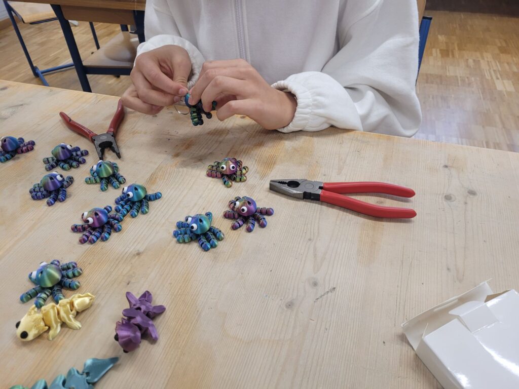 Im Werkunterricht entwerfen die Schüler Schlüsselanhänger, die zuhause und zum Teil in der Schule mit dem 3D-Drucker hergestellt werden. Hierbei lernen sie Vor- und Nachteile einer Serienfertigung kennen. In der Schule werden sie anschließend weiterverarbeitet und zusammengesetzt.
