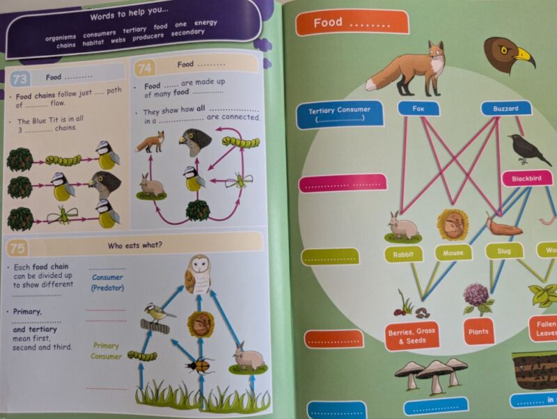 We’ve introduced specialized learning materials from Oaka Books (specifically the KS3 Environment: Feeding Relationships pack). These resources are designed for visual learners, using clear illustrations and “Hands-On” activities to help students understand the difference between a simple food chain and a complex food web.
