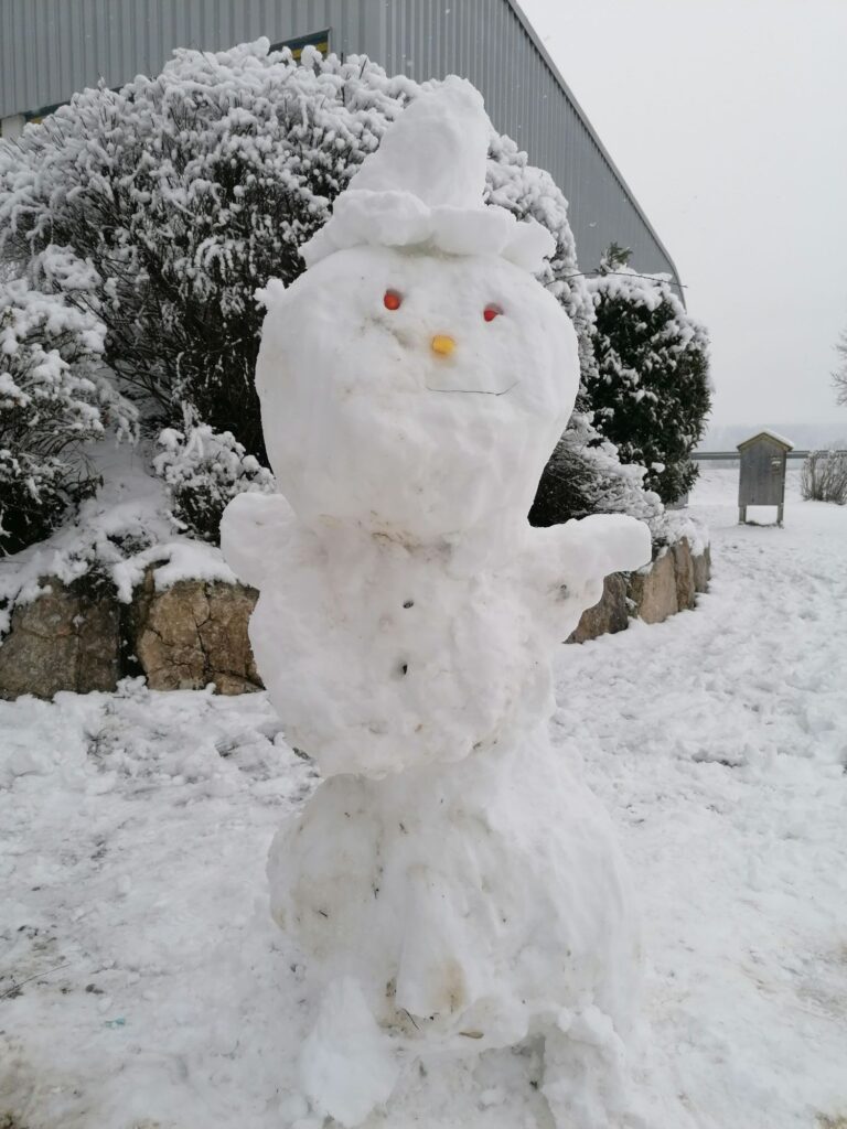 Diesen netten Schneemann ließen einige Mädchen während der großen Pause entstehen. Damit er sehen und riechen kann, teilten sie sogar ihre Jause mit ihm!