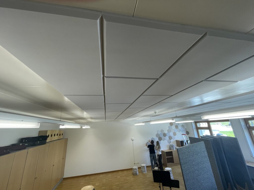 Die Arbeiter der Gemeinde brachten professionelle Deckenschallelemente an, die den Klang im Raum deutlich klarer und angenehmer machen. Dadurch profitieren sowohl die Musikschule als auch unsere Chöre bei ihren Proben von einer wesentlich besseren Klangqualität.